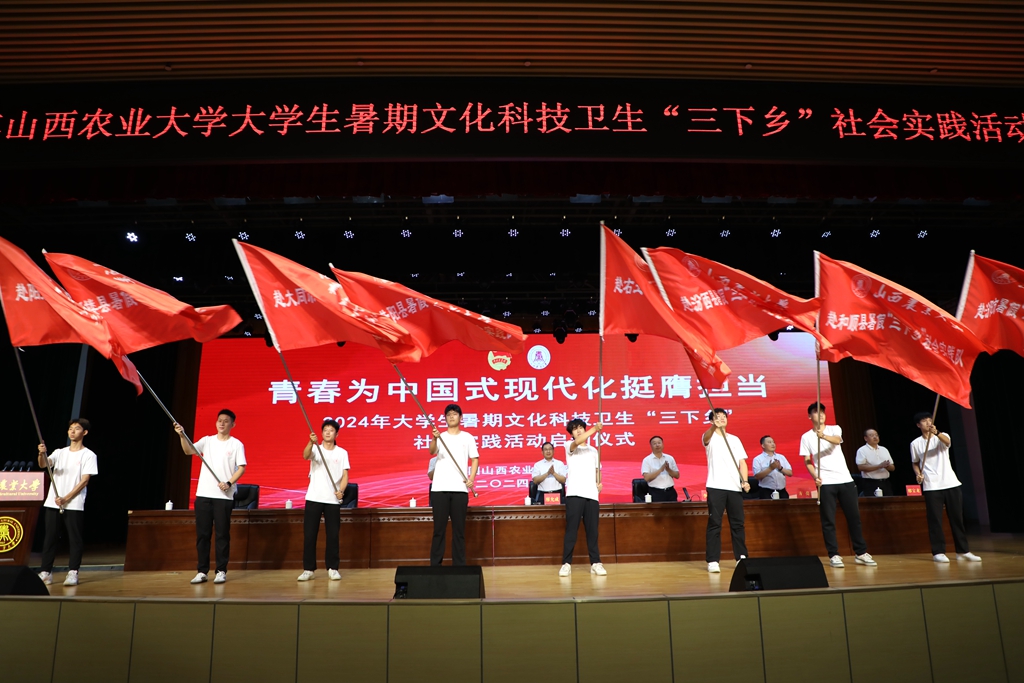 与会领导为各实践队授旗。各实践队学生代表共同挥舞旗帜,飞舞的旗帜激发了我校青年积极投身乡村振兴的信心。据悉,此次暑期“三下乡”社会实践活动,全校共50余支重点团队,上千人参与集中组队,将赴全省各地开展科技支农、教育关爱、文化传承、环境保护、普通话推广等专项实践活动。