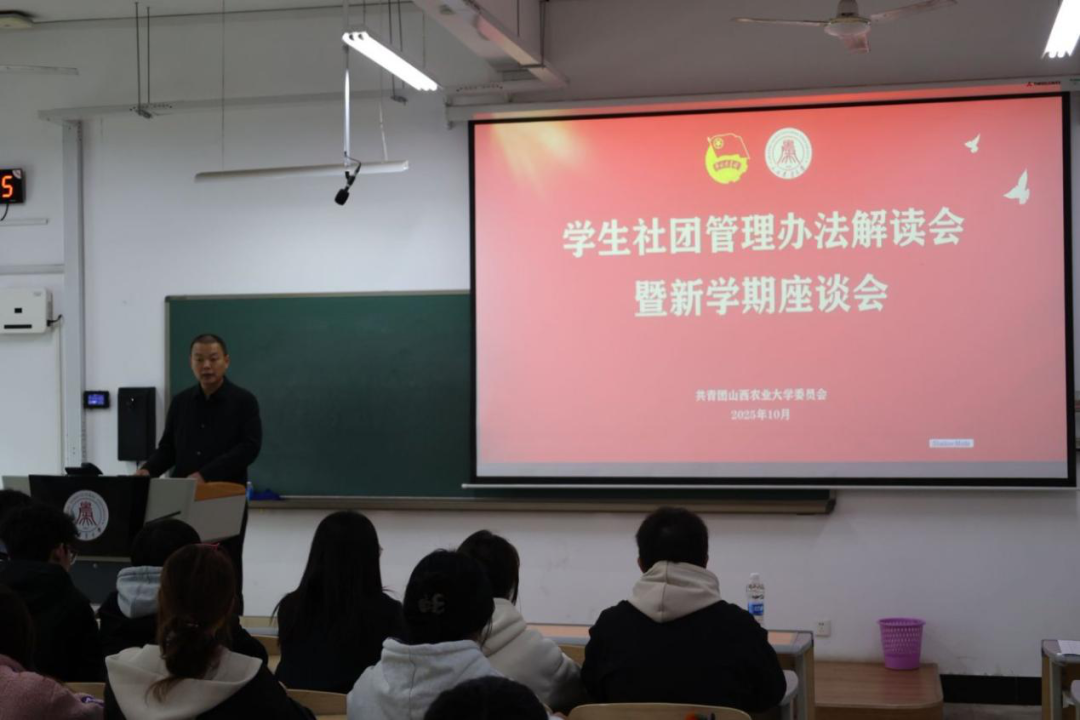 会上,程煜深入解读了《山西农业大学学生社团建设管理办法》,传达该办法核心精神。程煜详细解读了管理办法中社团注册登记、组织建设等关键内容,着重强调学生社团需坚守宗旨,按规定开展各项社团活动,严禁开展商业性及违法违纪活动,要举办具有思想性、艺术性、格调高雅的活动,确保社团活动方向正确、健康向上。
