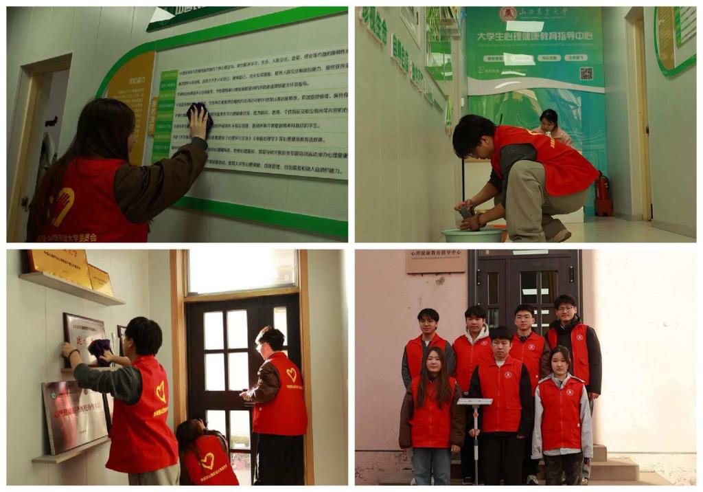 在心理健康教育指导中心,志愿者们对各功能区域进行了系统清洁,仔细拖洗地面、擦拭门窗玻璃,并对门板、扶手等高频接触部位进行重点清洁。同时,志愿者们还对公共区域堆放的杂物进行了分类清理,优化空间布局。经过集中清扫,心理健康教育指导中心环境焕然一新。