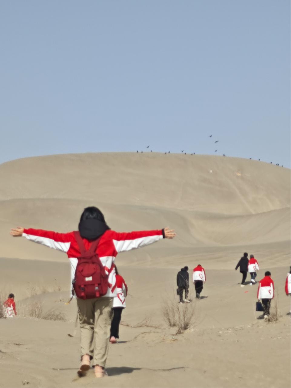 作为一名西部计划志愿者,我在塔克拉玛干沙漠参与义务植树的经历,是我人生中难以忘怀、最深刻的体验之一。这段经历不仅让我亲身感受到了自然环境的严酷与生命力的顽强,也让我对生态保护和个人成长有了更深层次的认识。首次踏足塔克拉玛干沙漠,我被其辽阔无垠的沙海、炽烈的阳光和呼啸的狂风所震撼。在这片与城市截然不同的世界中,我感受到了人类的渺小与自然的伟大。面对如此严酷的环境,我既感到敬畏,也深感责任重大——如果我们不采取行动,这片土地将被风沙永久侵蚀。义务植树的过程远比想象中艰难,沙漠的高温、干燥和风沙给工作带来了巨大挑战。然而每一次挥锹铲土、每一次浇水护苗,都让我感受到希望的力量。植树的过程虽然辛苦,但每当看到一棵棵幼苗在沙漠中挺立,我都会感到无比欣慰。通过我们的努力,这片荒漠正在逐渐变成绿洲,西部地区的生态环境也在持续改善。西北并非寸草不生,有爱的地方亦能繁茂如春。我深刻体会到了这项工作的意义与价值,它不仅是一次志愿服务的机会,更是一次成长的过程。