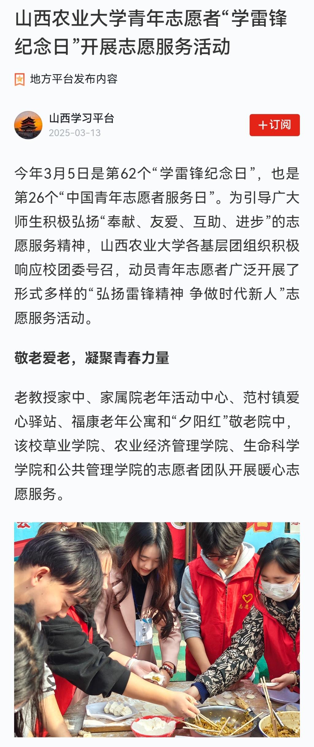 此次志愿服务系列活动将持续近一个月,山西农业大学团委鼓励该校各基层团组织创新活动形式,丰富活动内容,引导广大青年志愿者自觉做好新时代雷锋精神的倡导者、践行者和传承者,用实际行动为雷锋精神注入新的青春活力,让雷锋精神在新时代绽放更加璀璨的光芒。