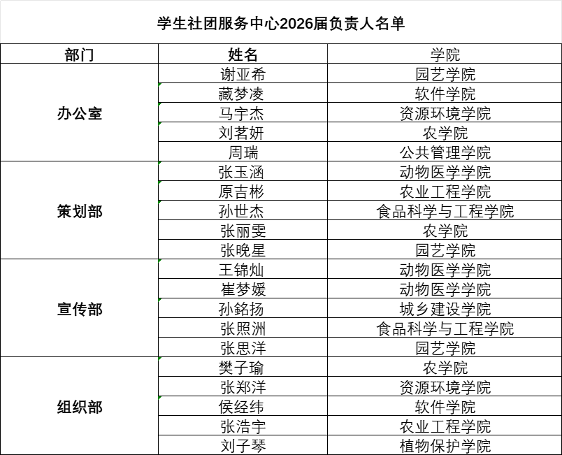 根据《山西农业大学学生社团服务中心2026届各部门负责人遴选通知》,经组织推荐、资格复审、面试等环节,山西农业大学学生社团服务中心2026届各部门负责人拟录用名单公示如下: